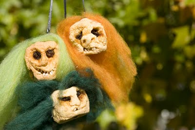 I didn't want to stop there. I added some bright orange, lime green, and dark green roving wool as hair. Then I stuck a safety pin through the top of the core (where the stem usually is) and tied a thin black ribbon through it.